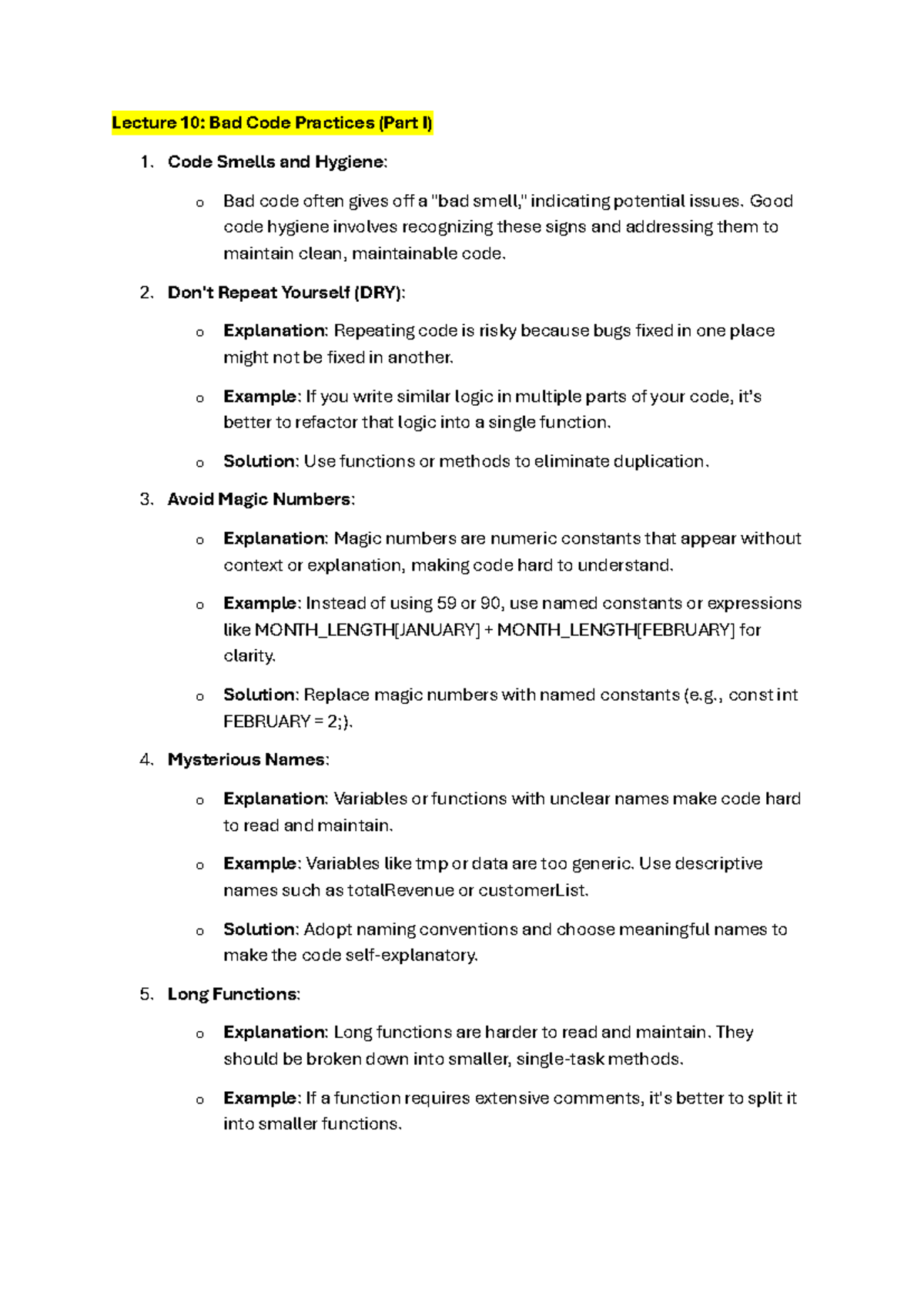 Lecture 10 & 11: Bad Code Practices Overview and Solutions - Studocu