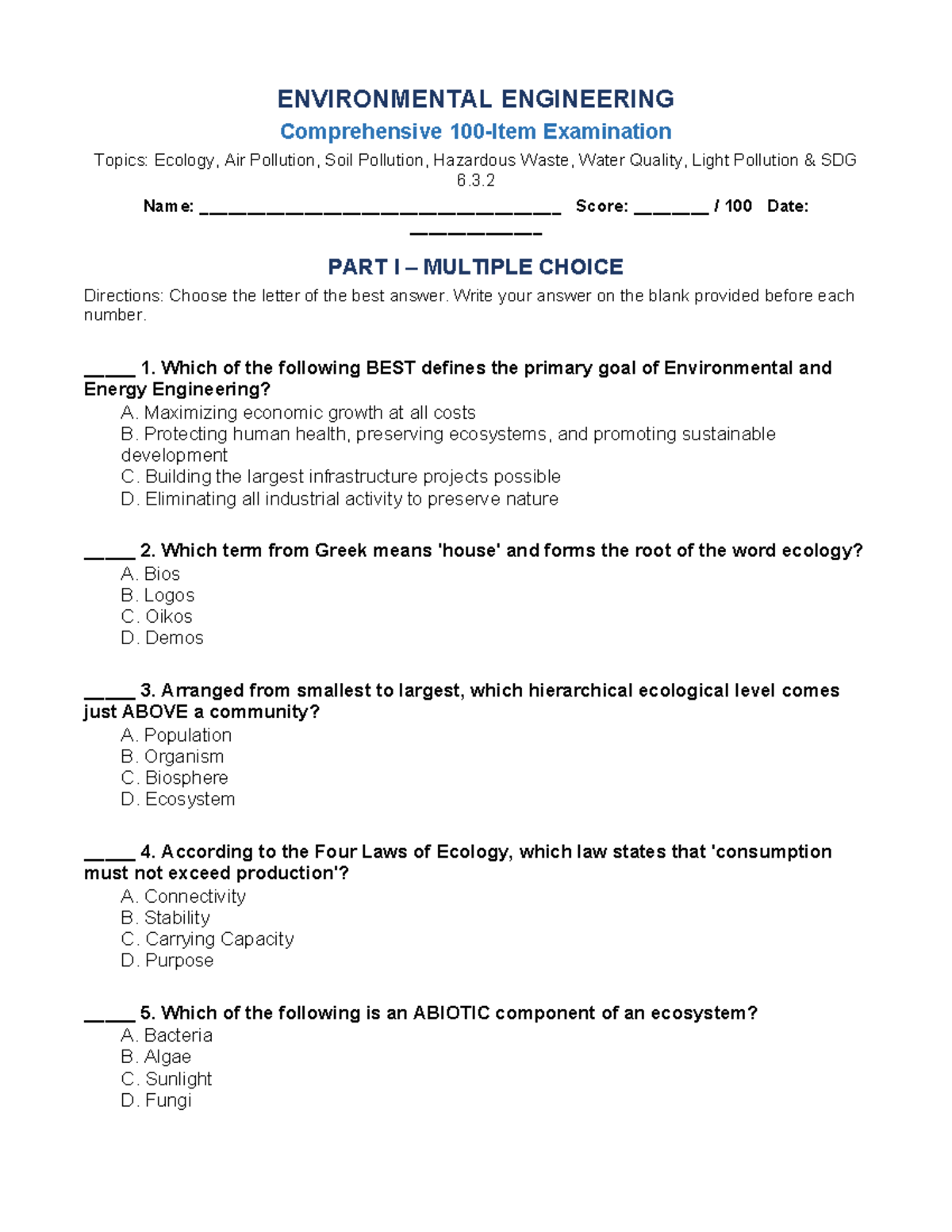 Environmental Engineering SDG 6.3.2 Comprehensive Exam Review - Studocu