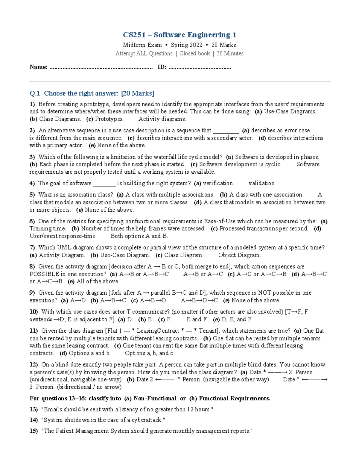 CS251 Software Engineering 1 All Midterm Exam Questions Compilation ...