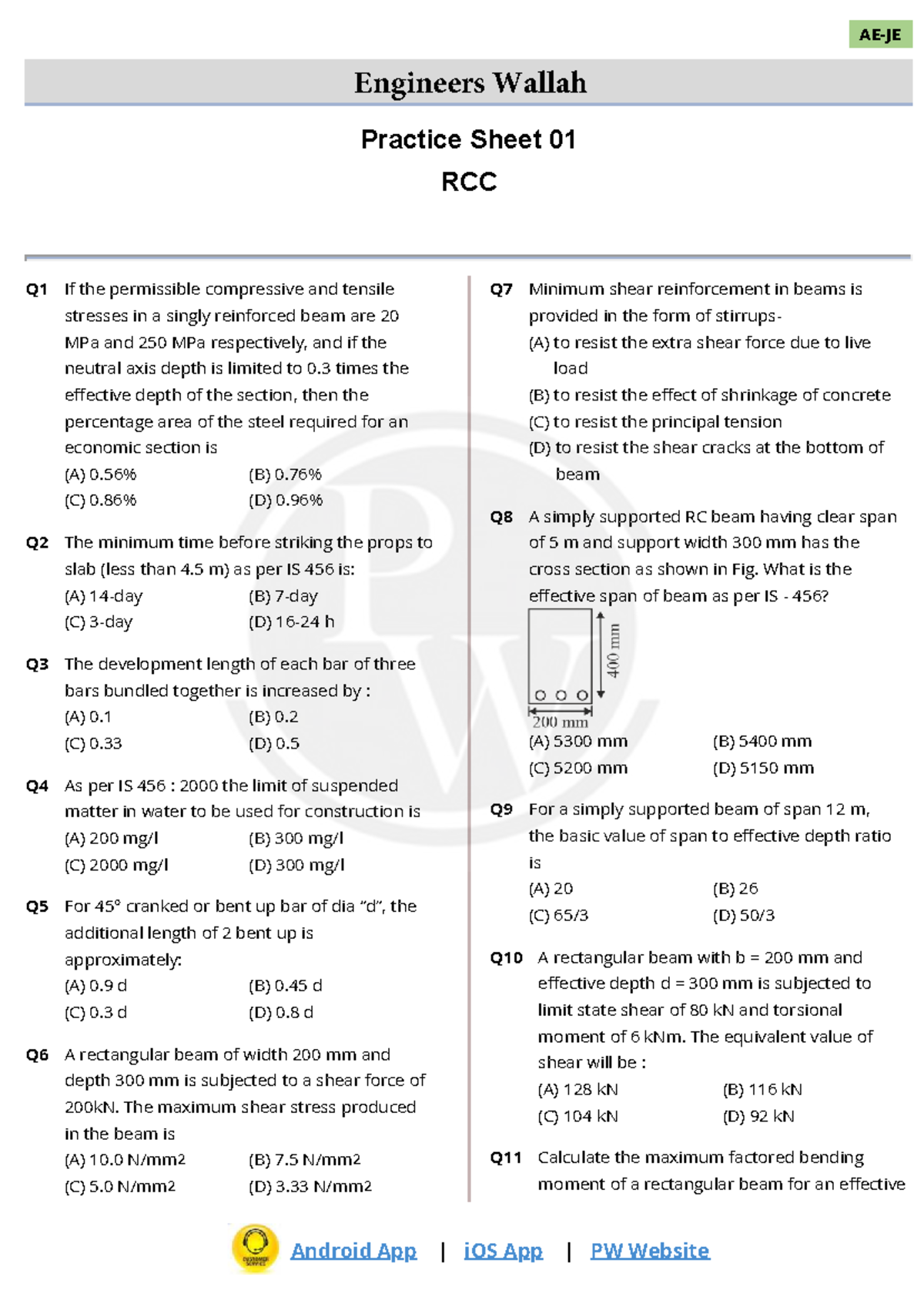 RCC Practice Sheet 01 - Engineers Wallah Notes on Beam Design - Studocu