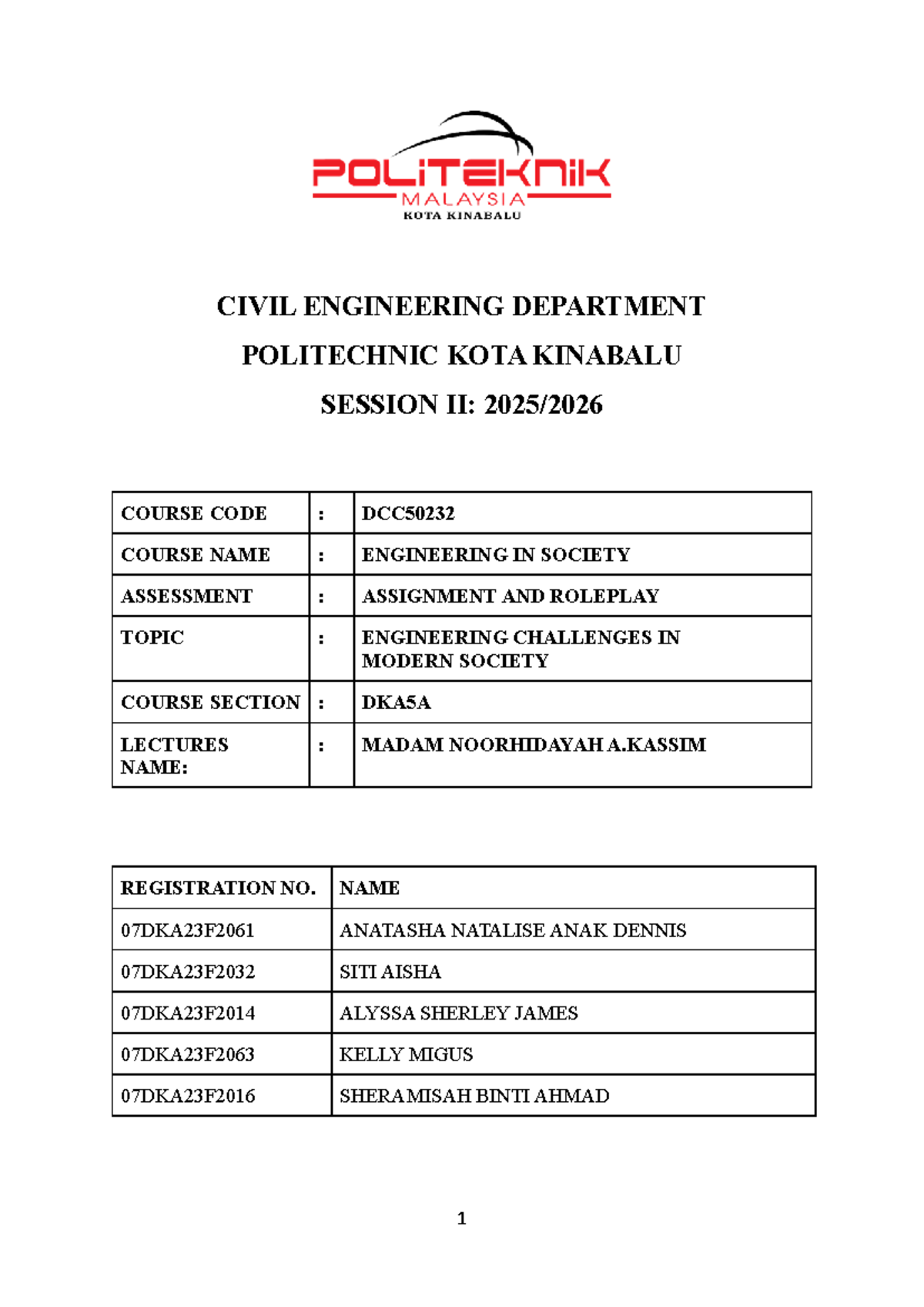 CIVIL ENGINEERING DCC50232: Engineering Challenges in Modern Society ...
