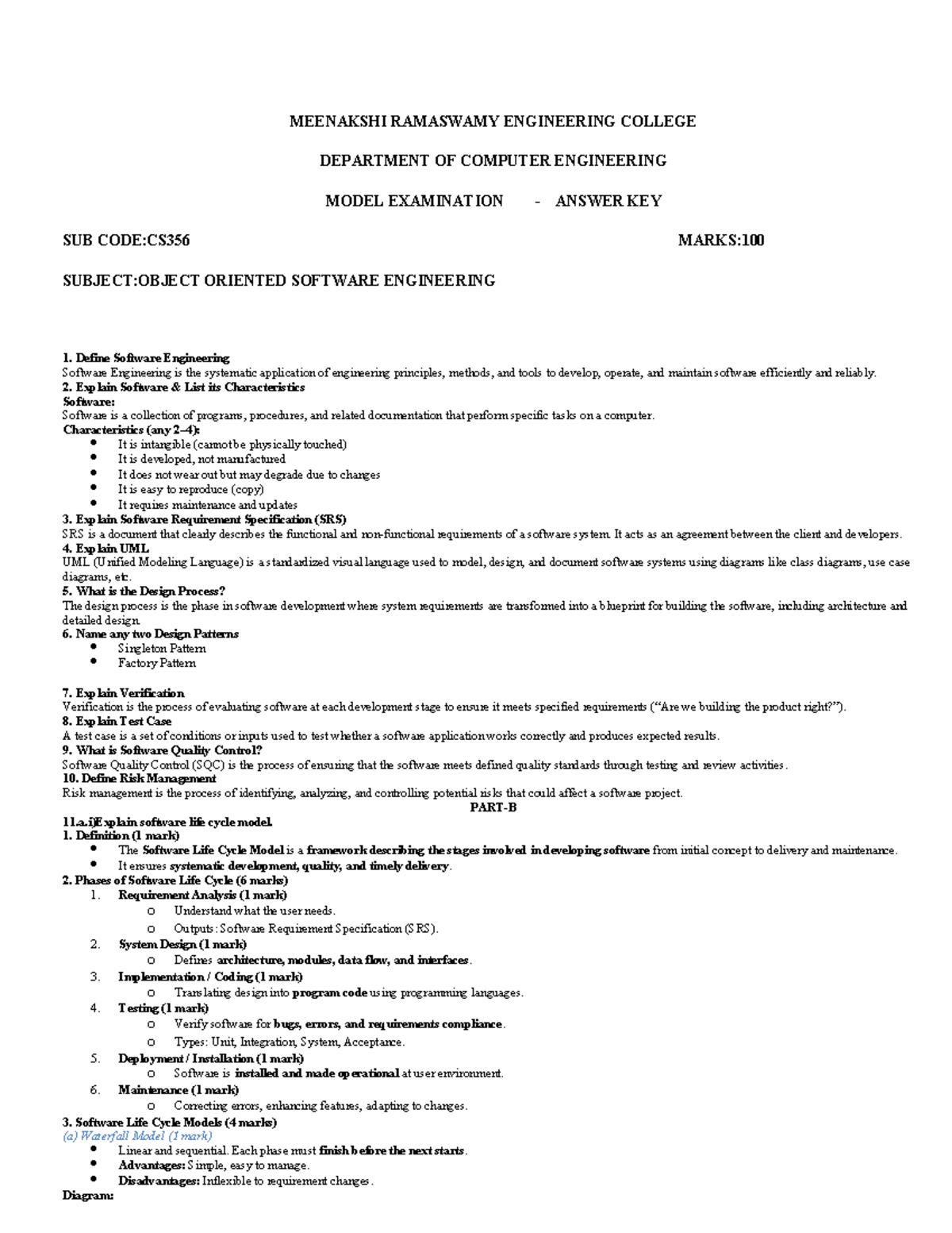CS356 Model Exam Answer Key: Object Oriented Software Engineering - Studocu