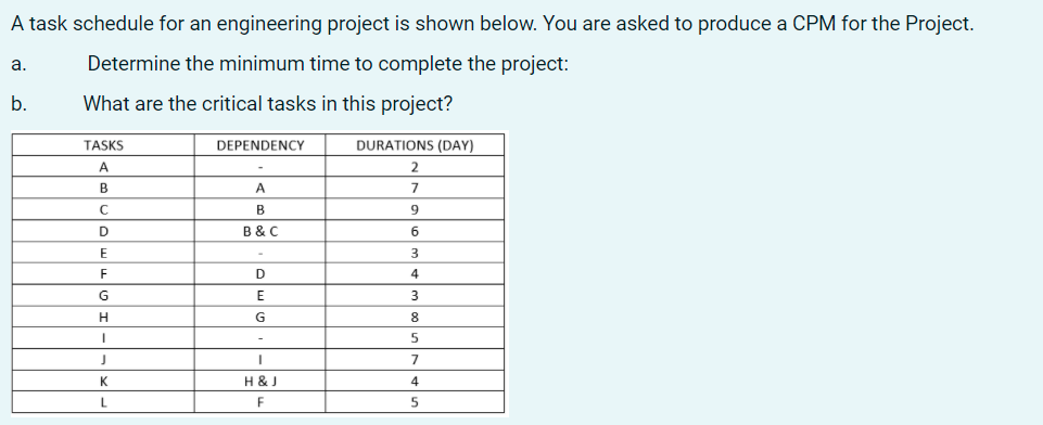 Solved A task schedule for an engineering project is shown | Chegg.com