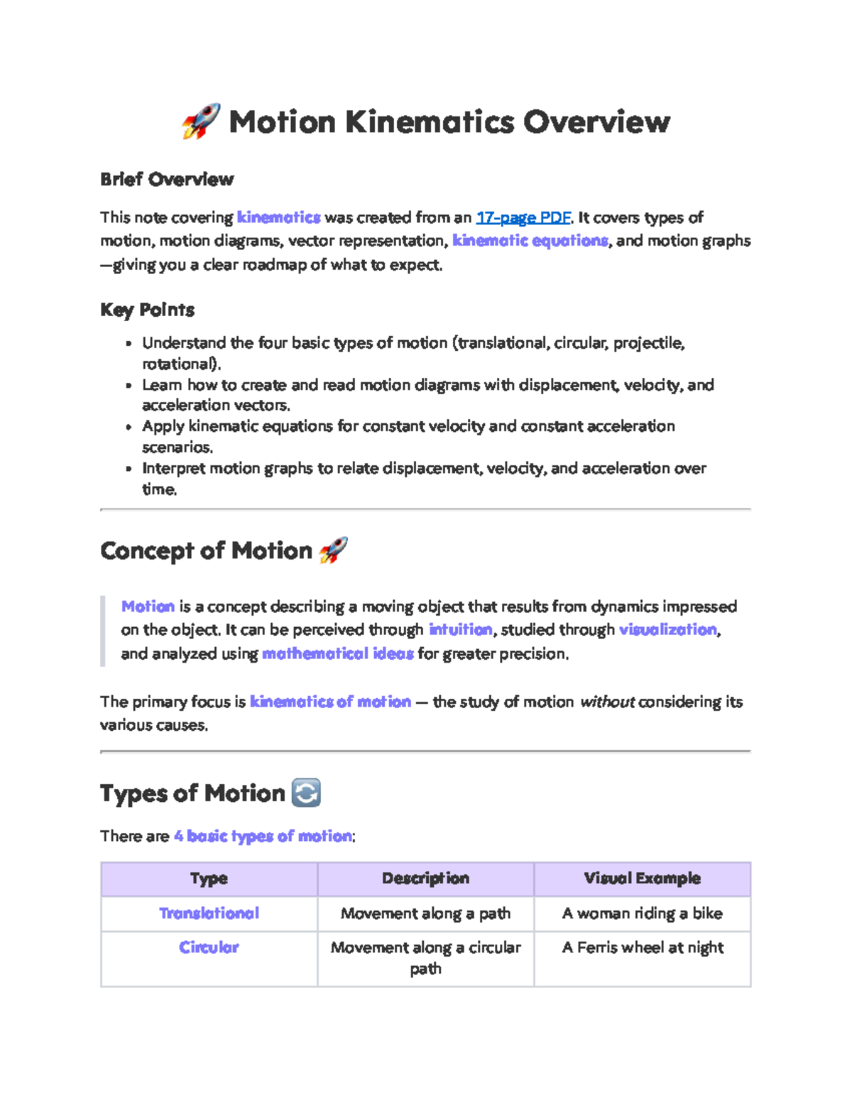 Kinematics Overview: Types of Motion and Analysis (PHYS 101) - Studocu
