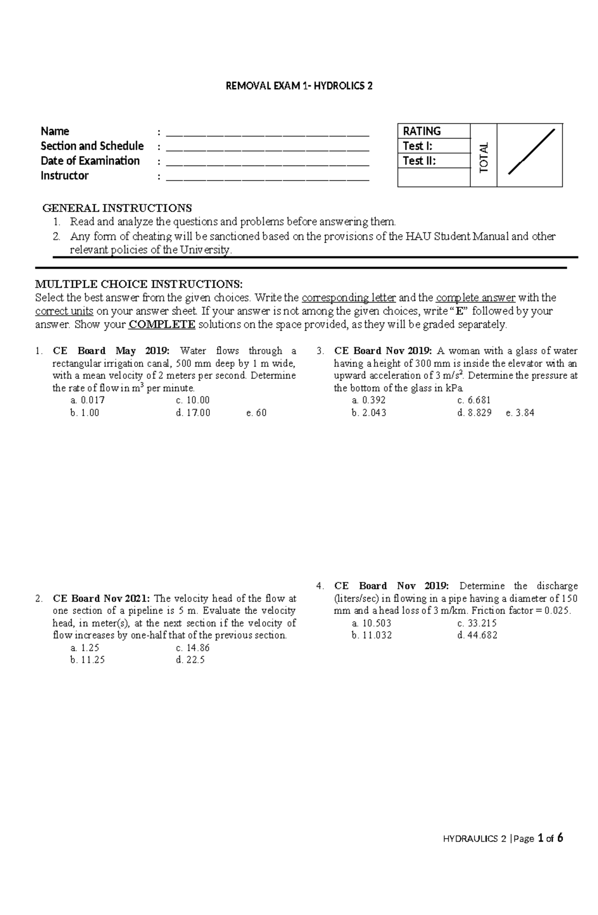 Hydraulics 2 - Removal Exam 1 Review and Practice Questions - Studocu