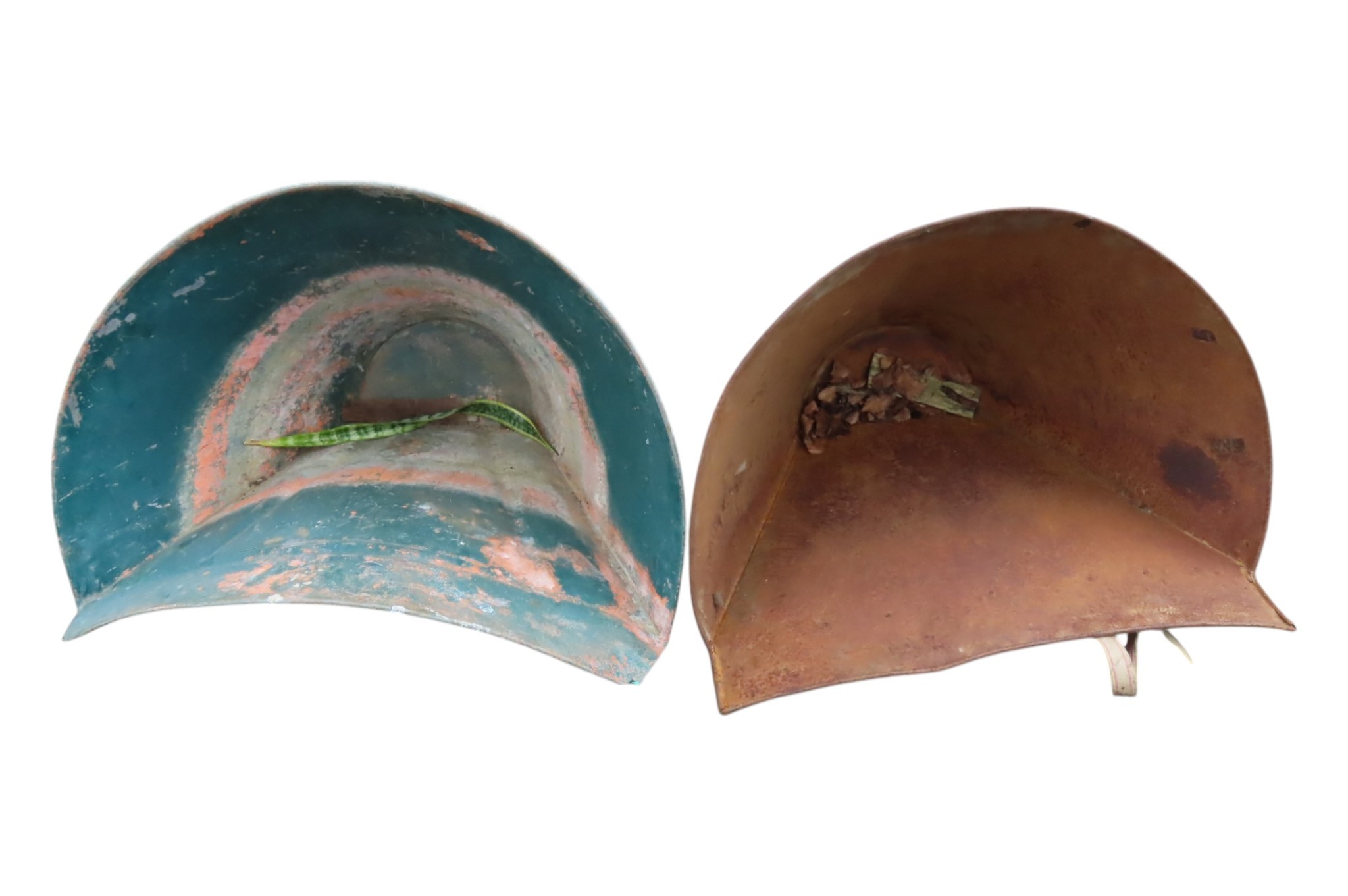 Two vintage weathered galvanised steel grape hods, the slightly larger ...