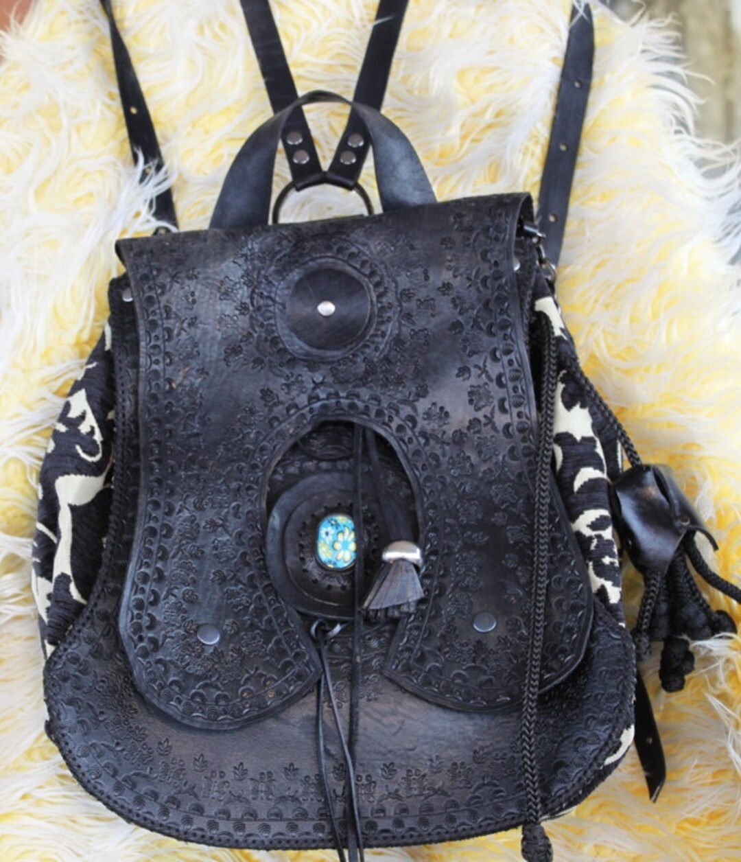 Leather Black Engraved Backpack, Leather and Lace Engraved Tapestry ...