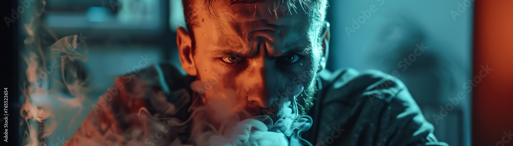 Enraged programmer, smoke puffing from ears, close view, dark room ...