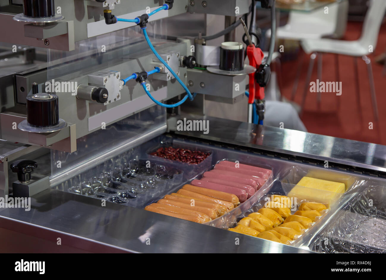 Linear tray food heat sealing and packing machine Stock Photo - Alamy