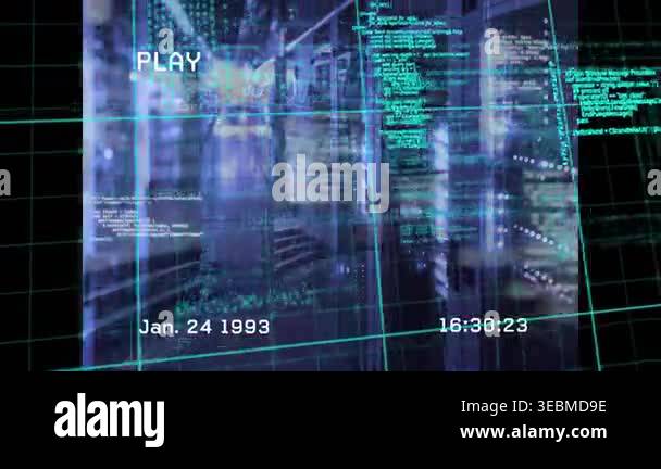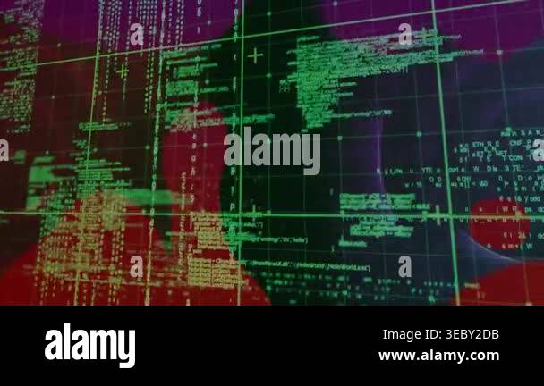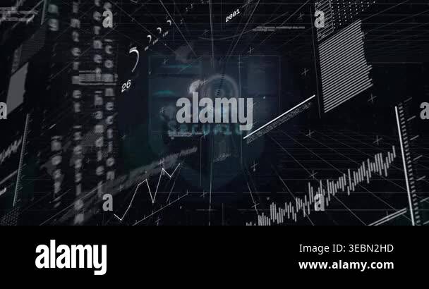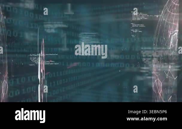 Scrolling binary grid spurring wireframe globe emerging rotating for ...