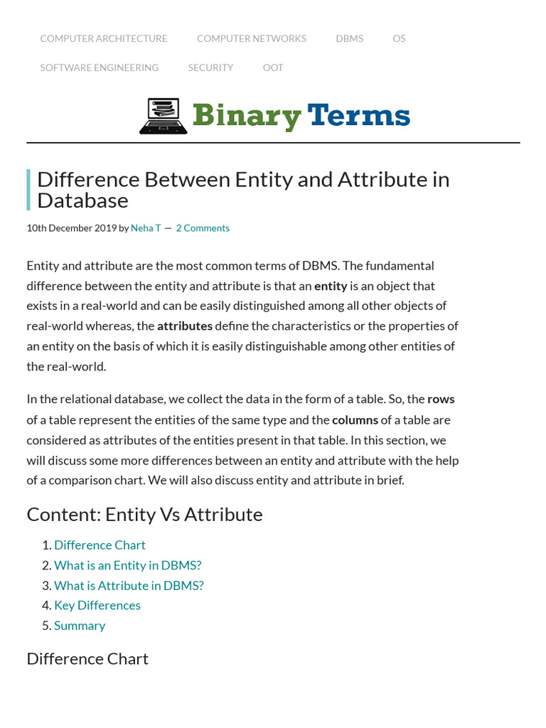 Difference Between Entity and Attribute in Database - Binary Terms