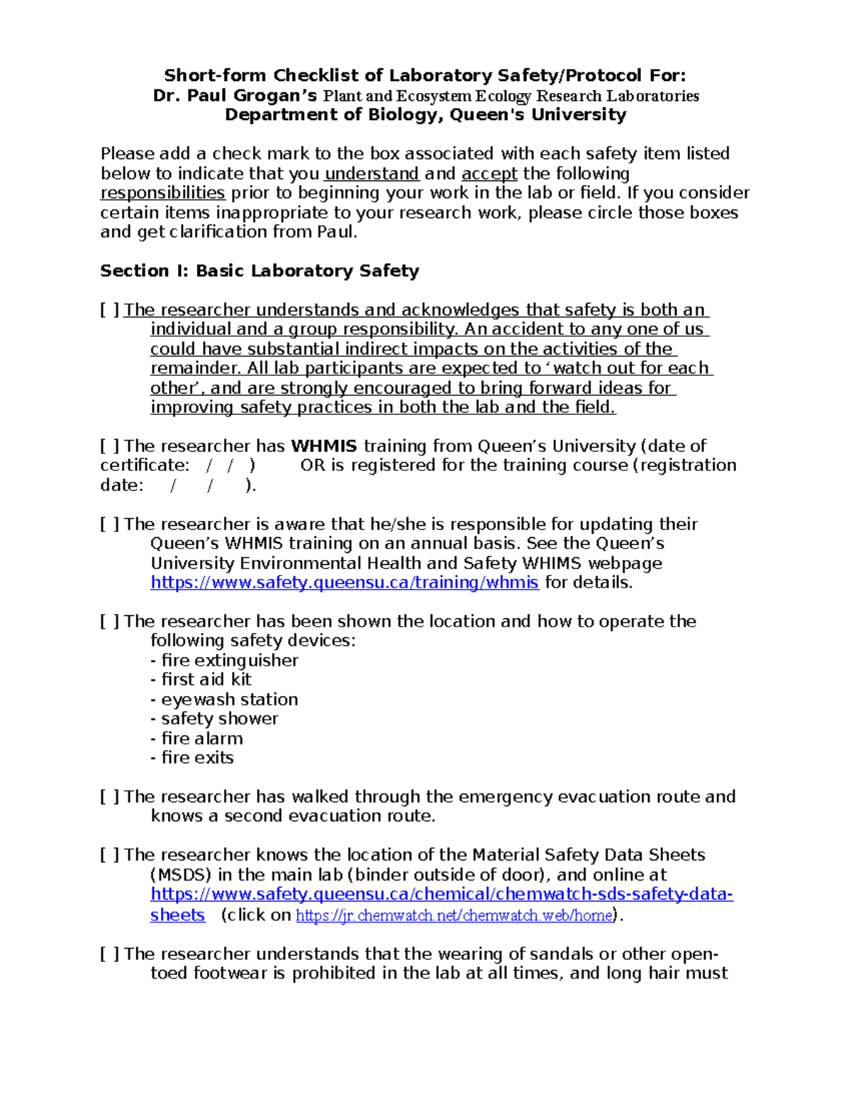 Lab Safety Checklist (Short Form) for Ecosystem Ecology Research Lab ...