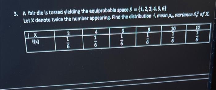 Solved 3. A fair die is tossed yielding the equiprobable | Chegg.com