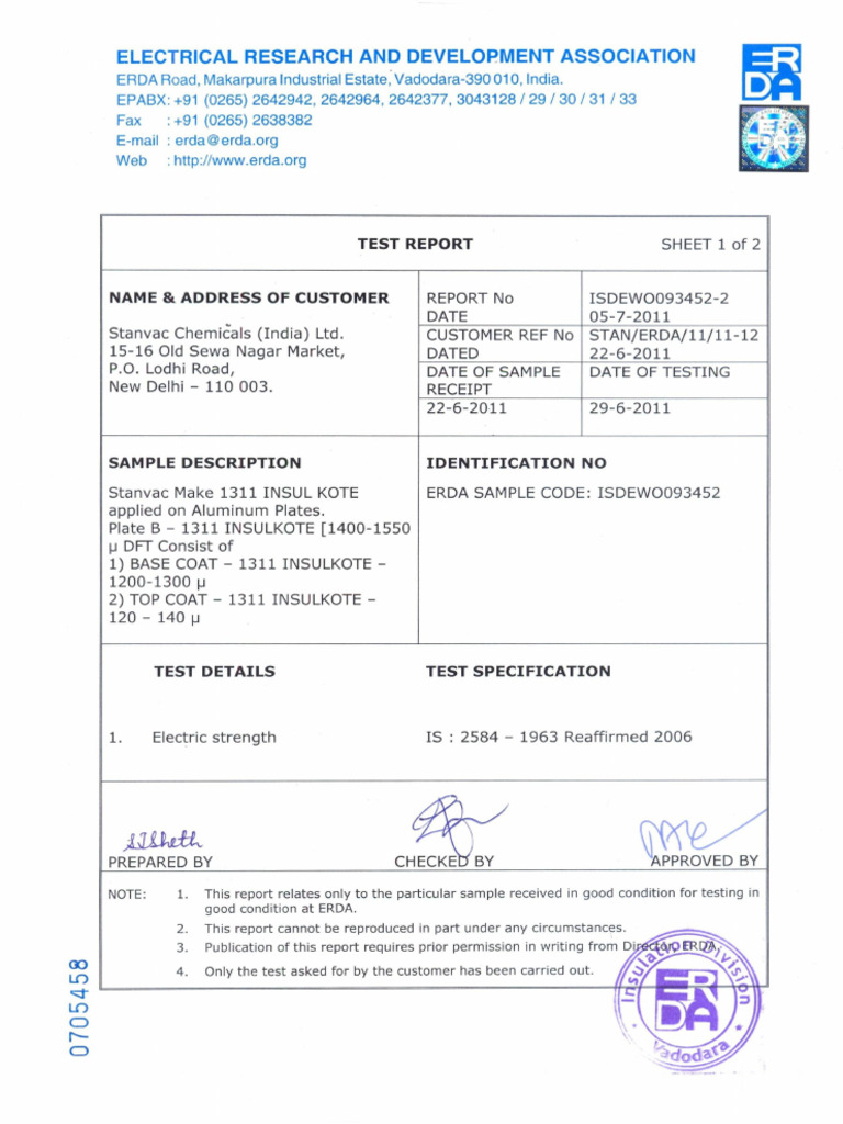Erda Test Report Stangard 1311 Insulkote (Class B) | PDF