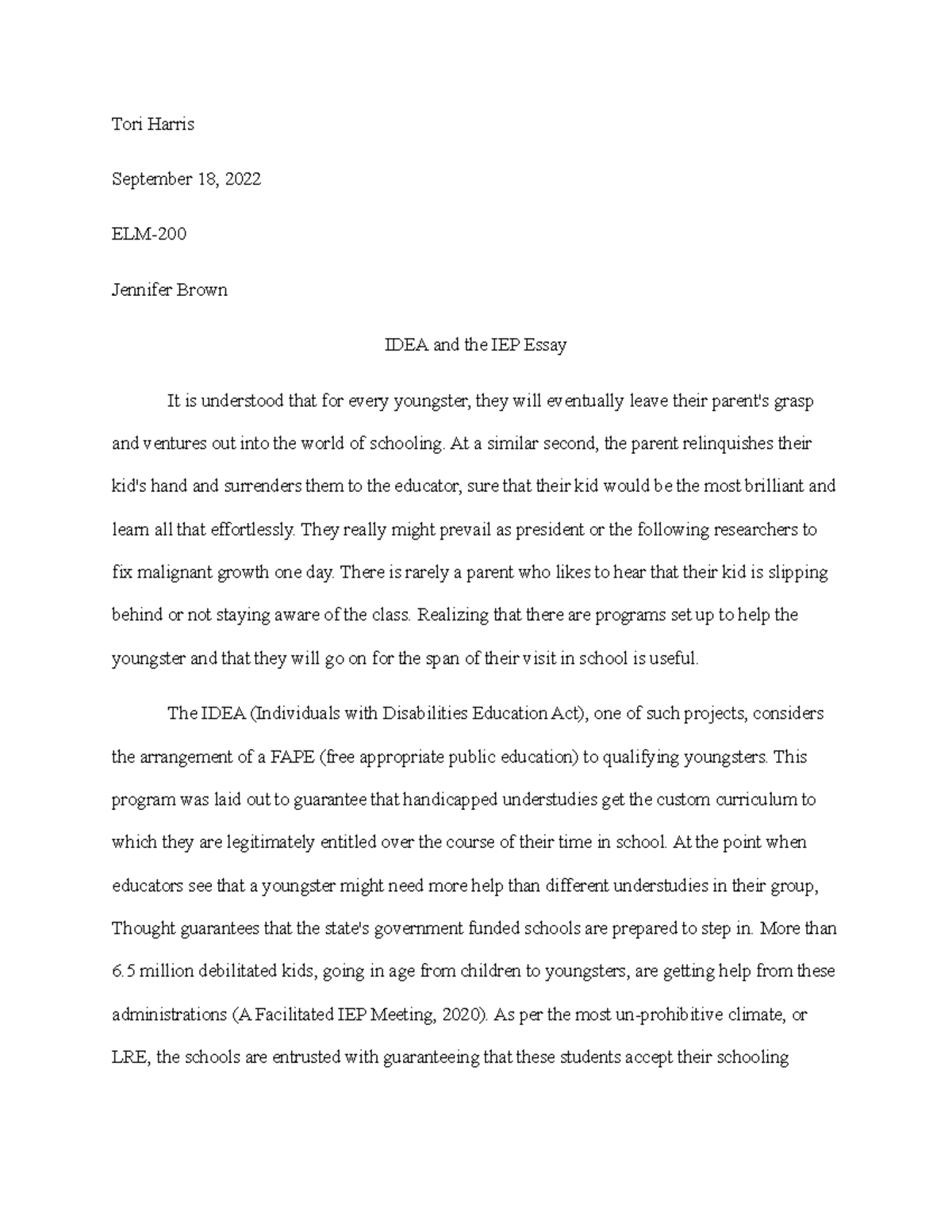 Week 1 essay - notes - Tori Harris September 18, 2022 ELM- Jennifer ...