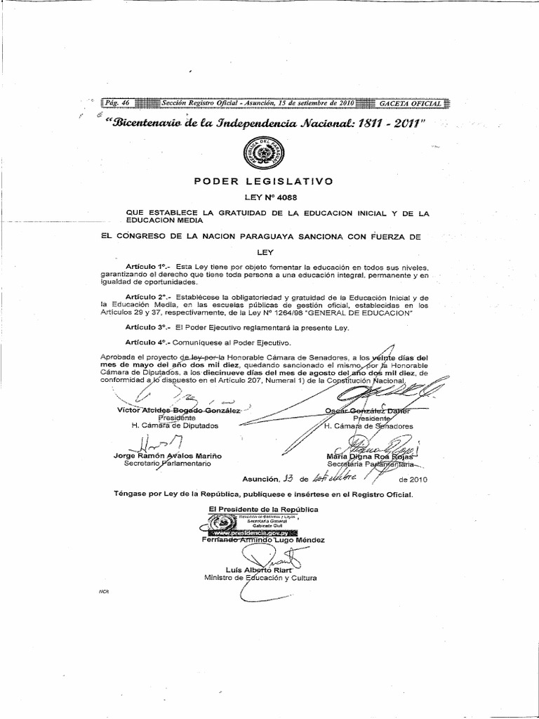 Ley 4088. Establece La Gratuidad de La Educacion Inicial y Primaria | PDF