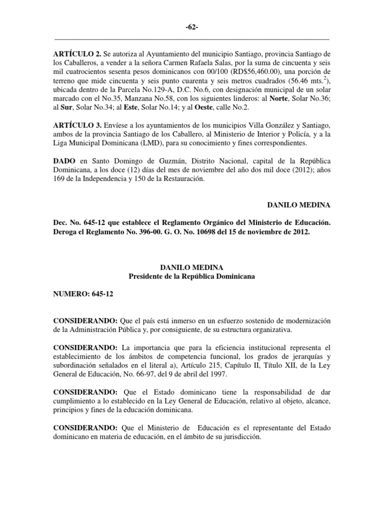 Decreto No645 12 Que Establece El Reglamento Orgánico Del Ministerio de ...