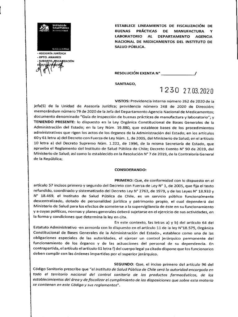 Resolución #1230-20 Establece Lineamiento de Fiscalizacion de GMP-BLP | PDF