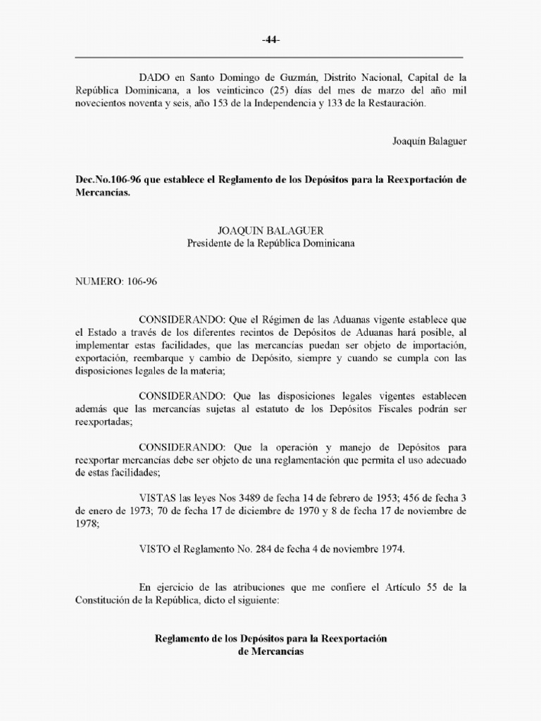 106-96 Que Establece Reglamento Depositos | PDF | aduana | Gobierno