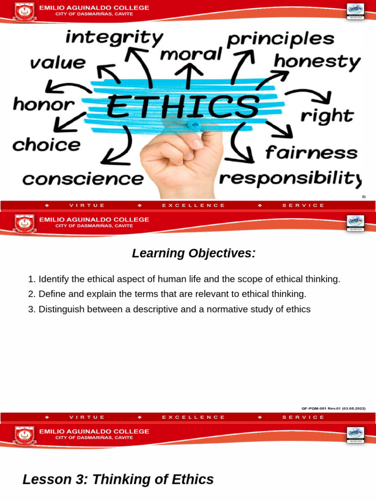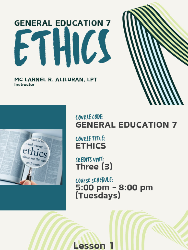Ethics - study this lecture notes - ETHICS LESSONS AND COVERAGE LESSON ...