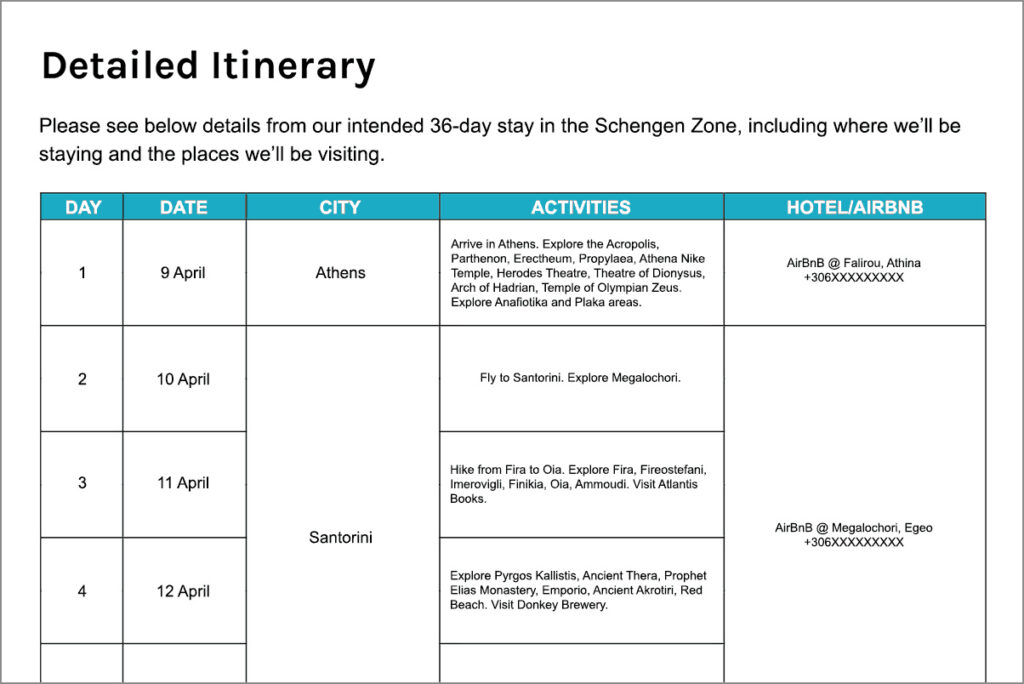 Travel Itinerary Template For Schengen Visa