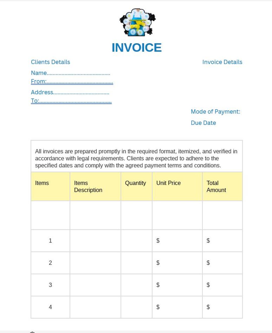 Cleaning Invoice Template Blank Printable PDF, Excel, Word