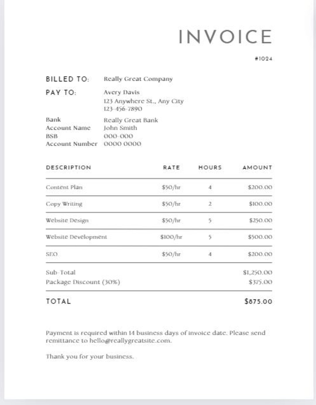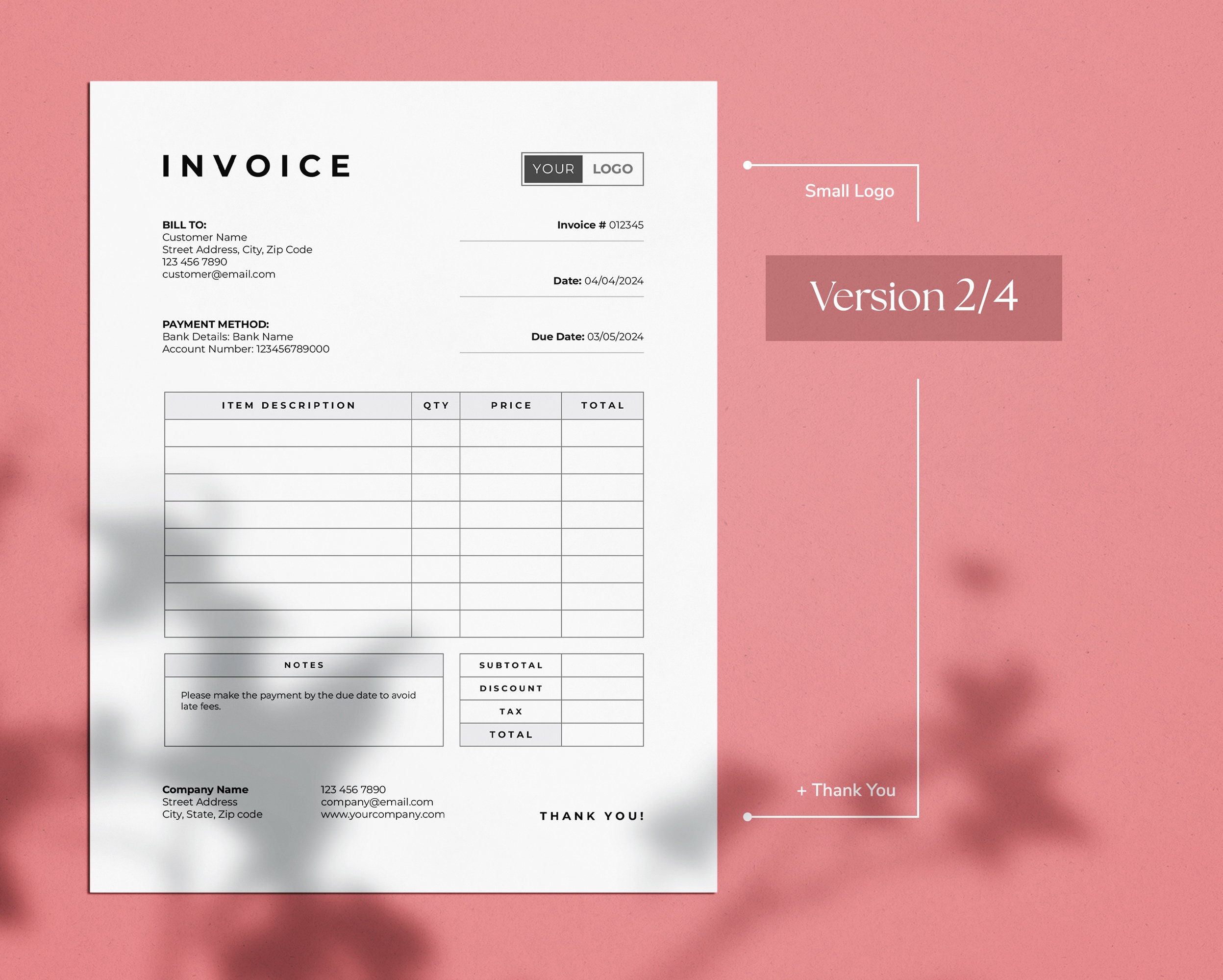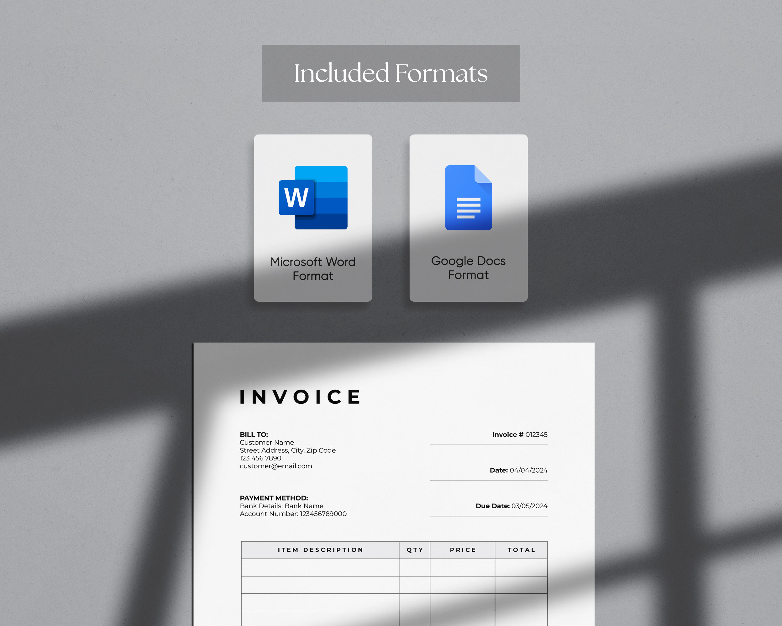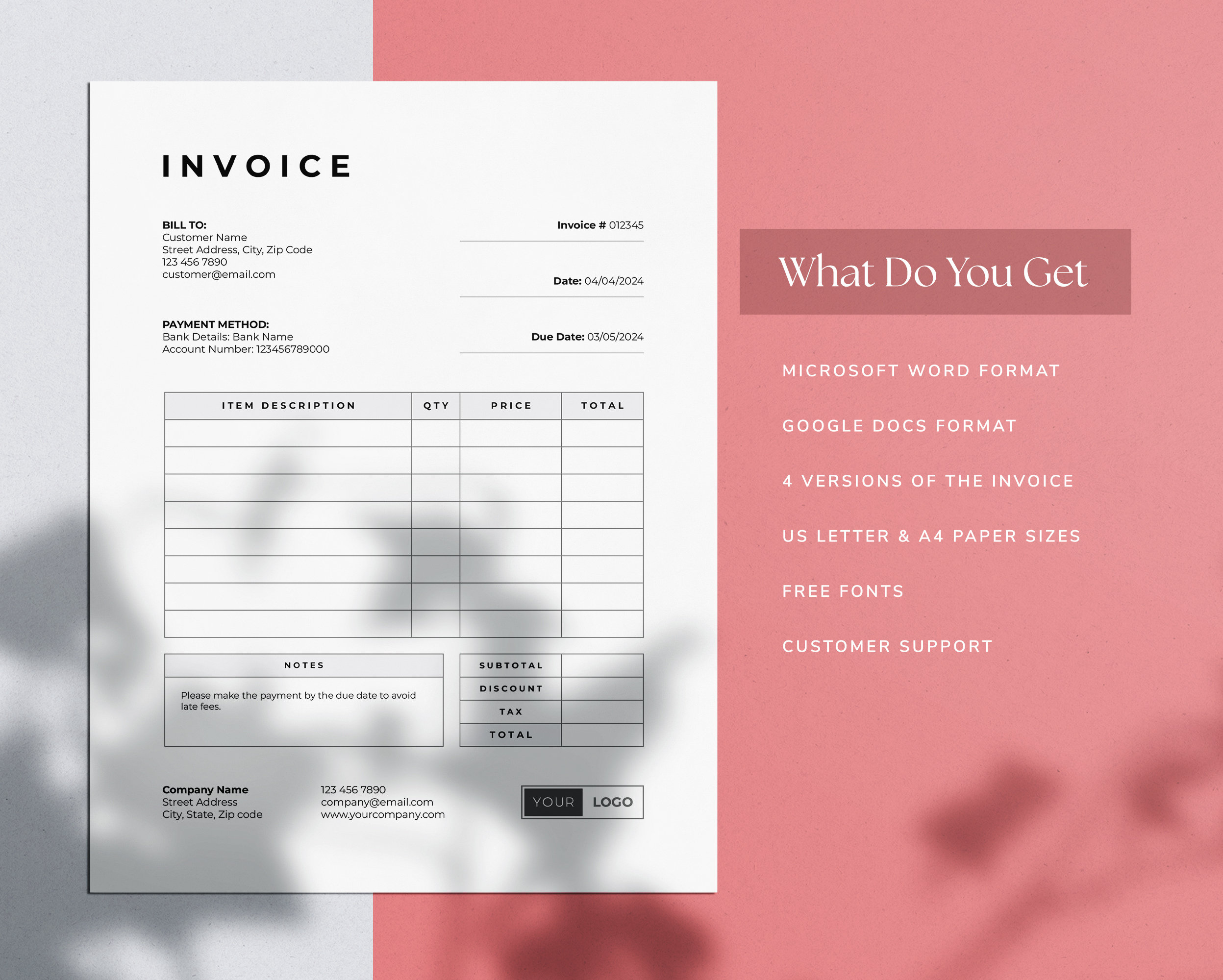 Clean Invoice Template for Microsoft Word and Google Docs, 4 Versions ...