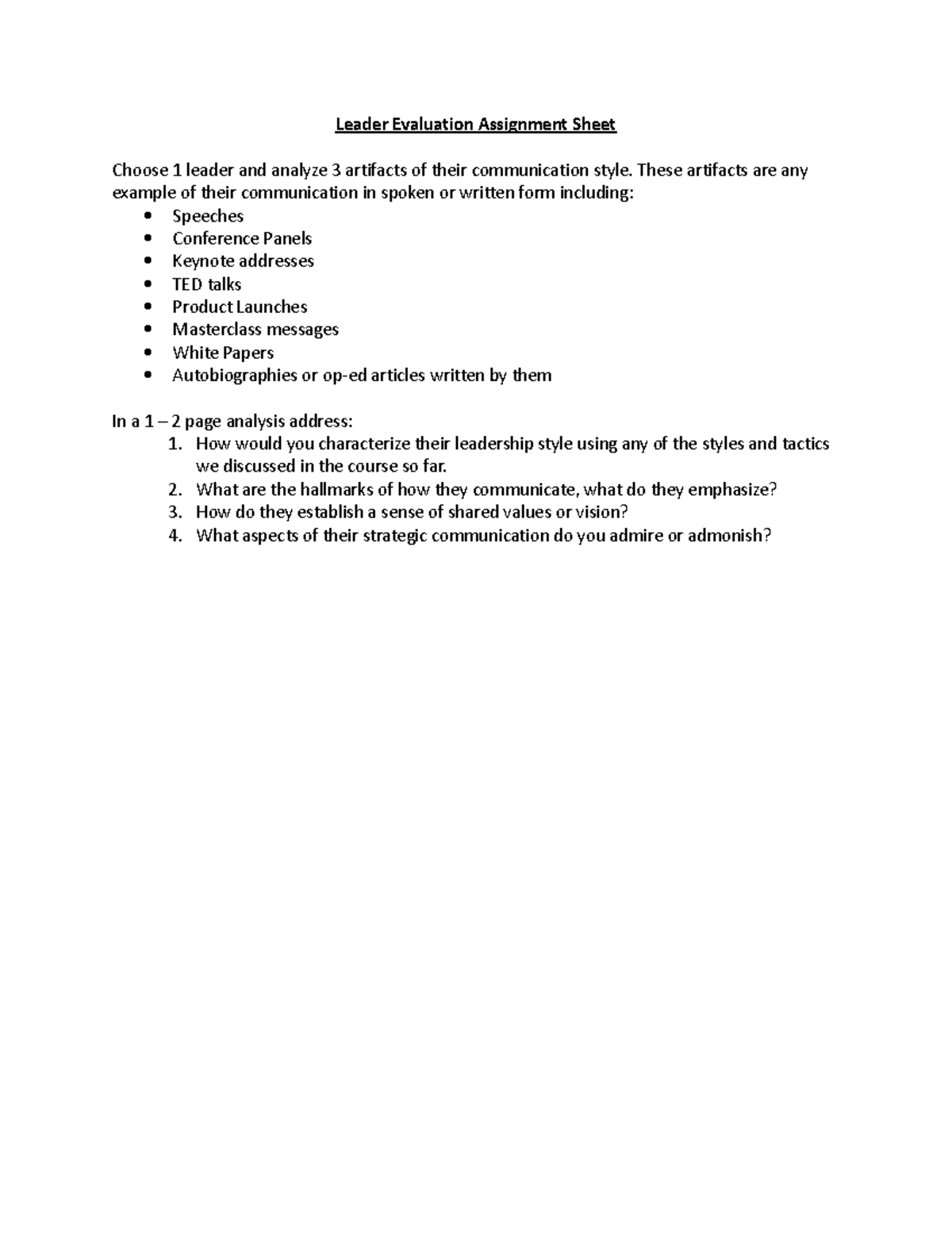 Leader Evaluation Assignment Sheet - These artifacts are any example of ...