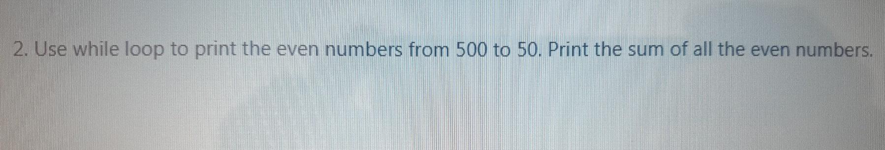 Solved 2. Use while loop to print the even numbers from 500 | Chegg.com