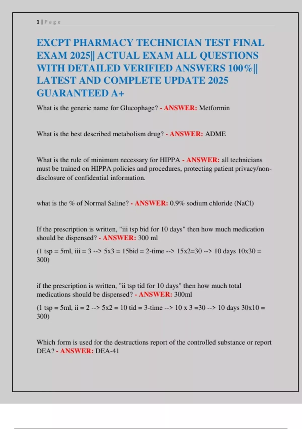 Pharmacy Technician Practice Exam I 120 Questions Mutiple Choice PTCE ...