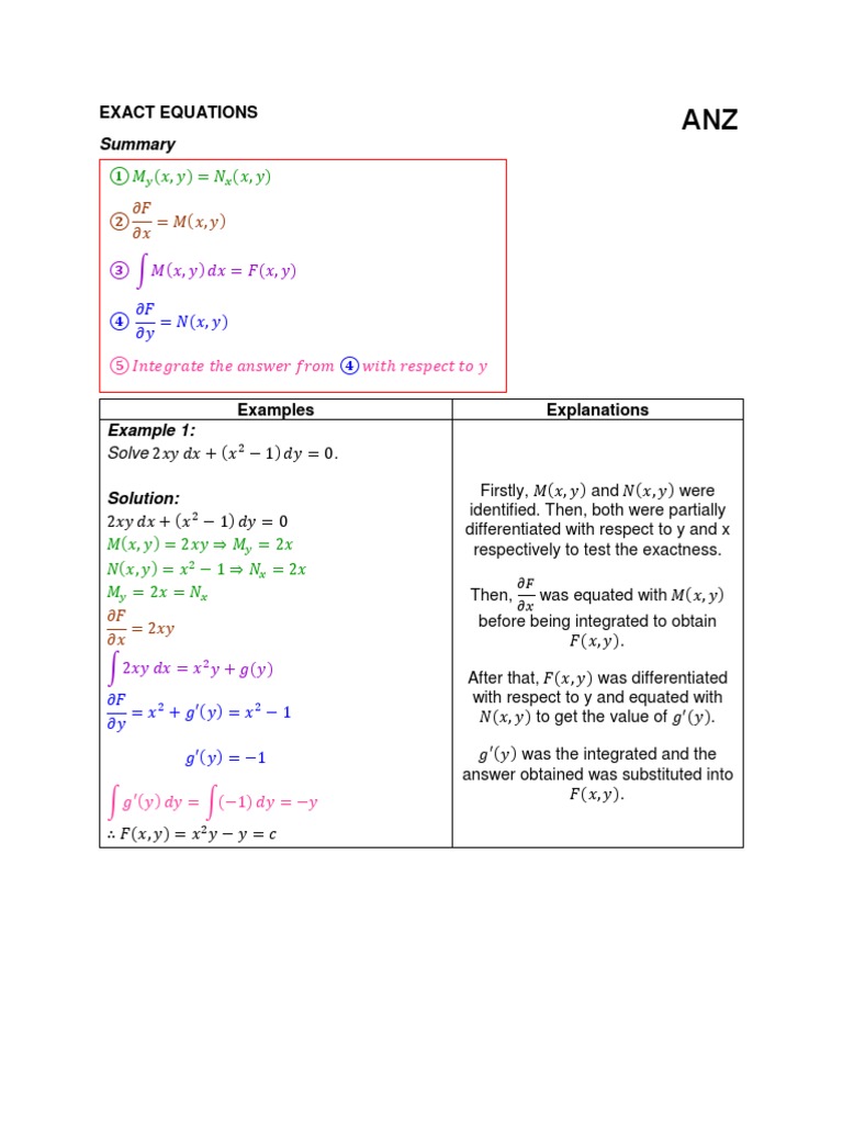 Exact Equations Cheat Sheet – MAT2680 Differential Equations