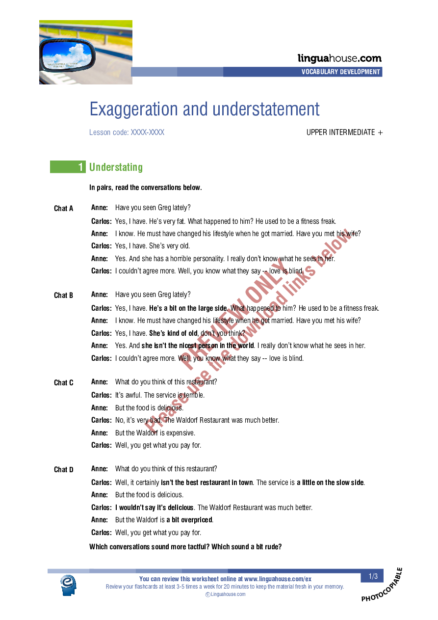 Exaggeration and understatement: Worksheet Preview - Linguahouse.com