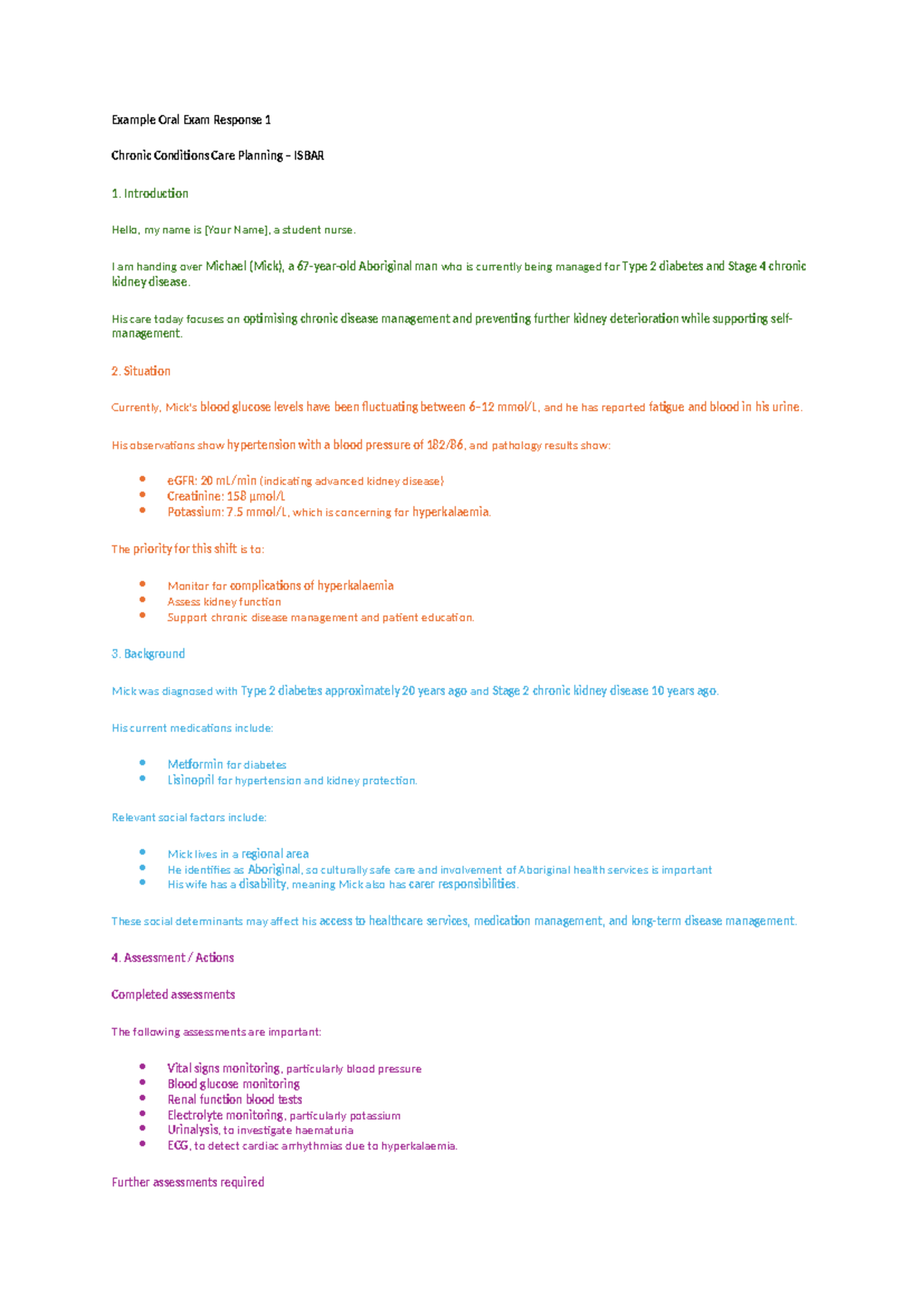 Example Oral Exam Response NSB231: Chronic Conditions Care Planning ...