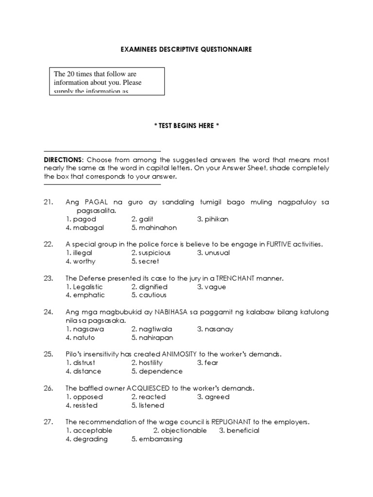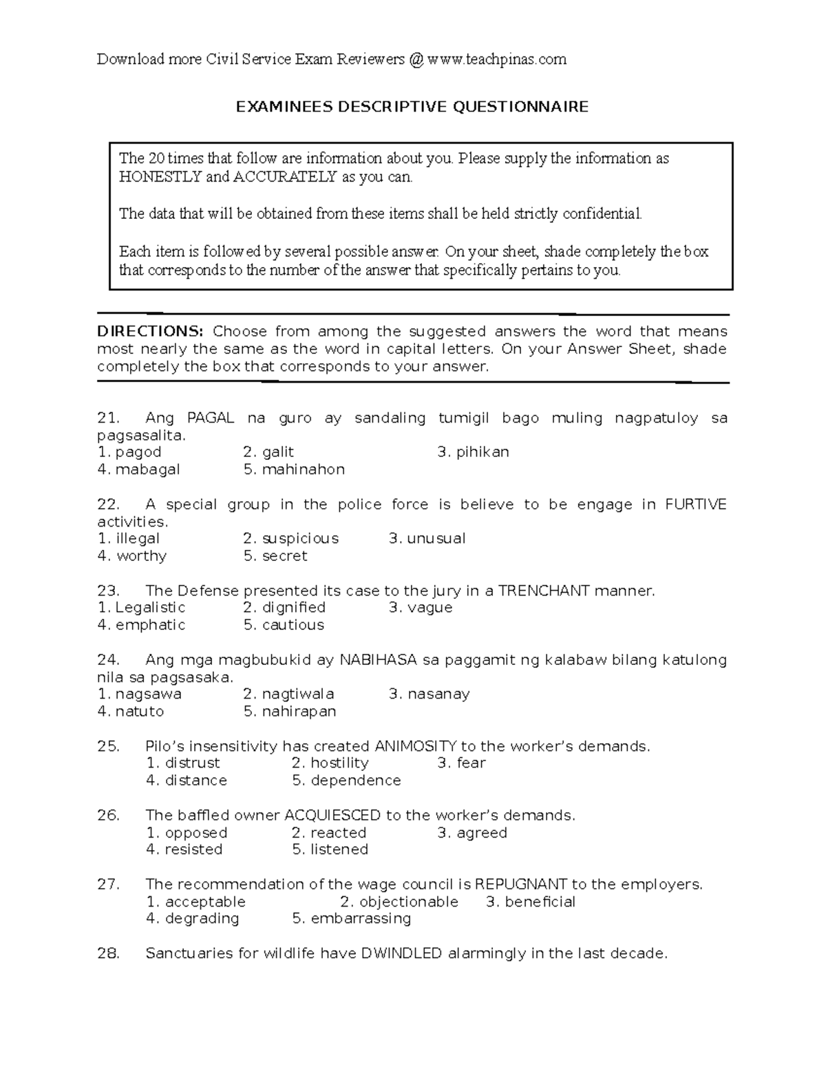 CSC1- CSE Reviewer 21-170 - EXAMINEES DESCRIPTIVE QUESTIONNAIRE * TEST ...