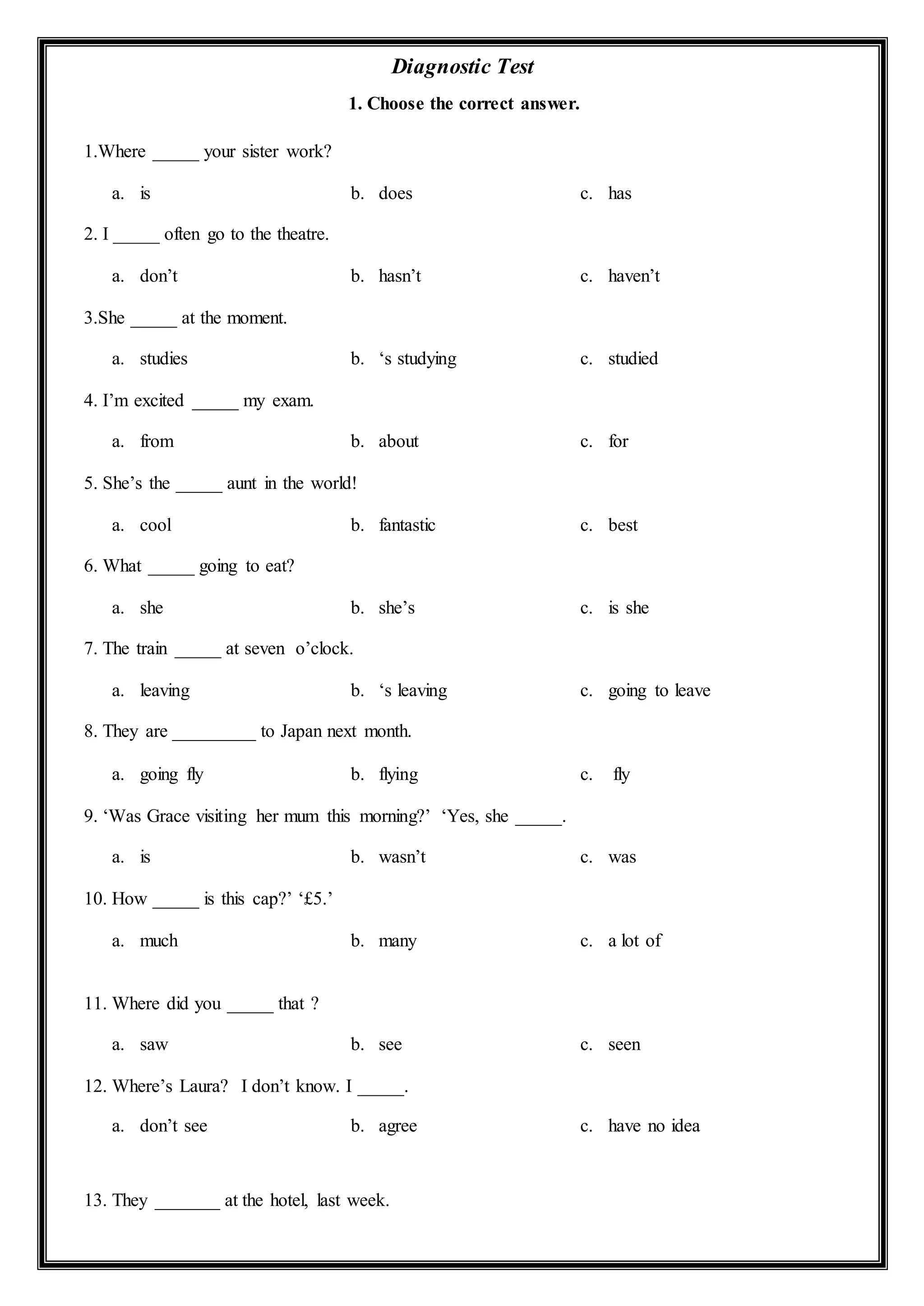Printable Grammar Diagnostic Test English Practice Test With Answers