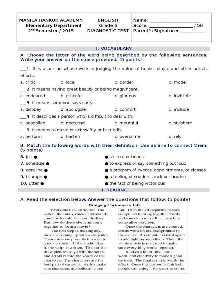 Diagnostic Test Grade 2 English: Academia de San Pedro Calungsod | PDF ...