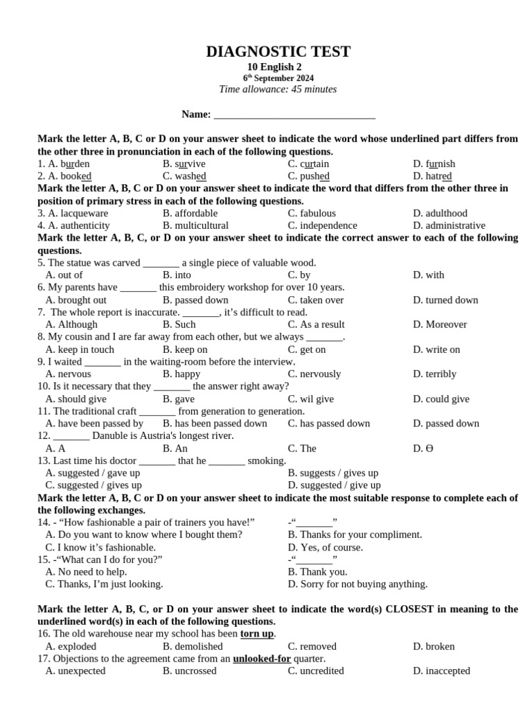 Fillable Online Diagnostic test examples in english. Diagnostic test ...