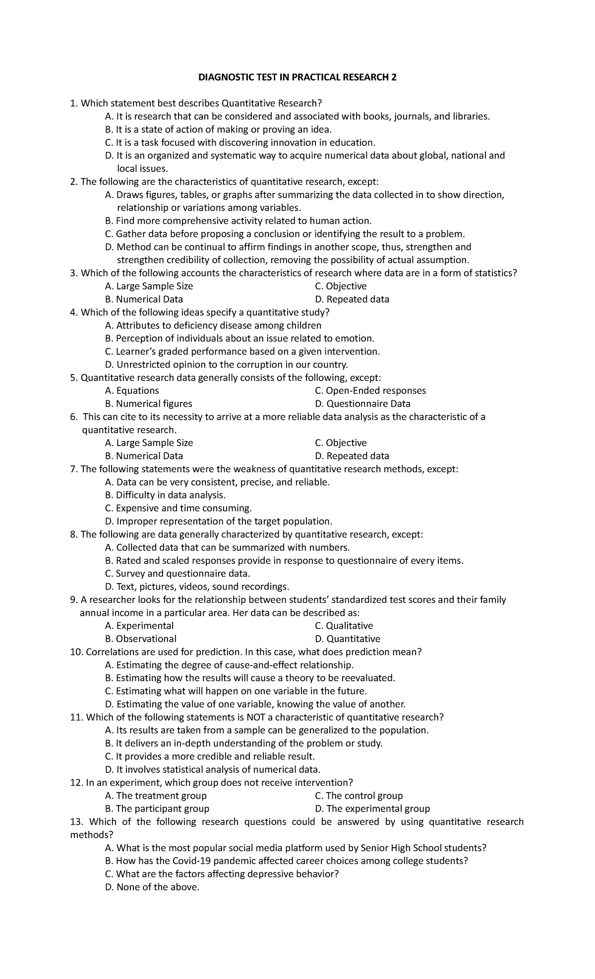 Diagnostic Test for Practical Research 2: Key Concepts & Examples - Studocu