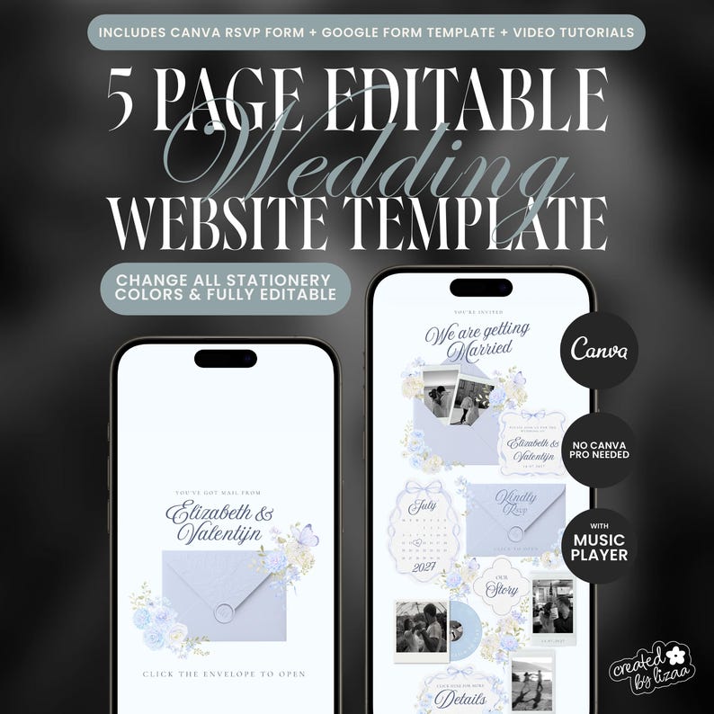 Dusty Blue Wedding Website Template, Music Player, RSVP Form (digital ...