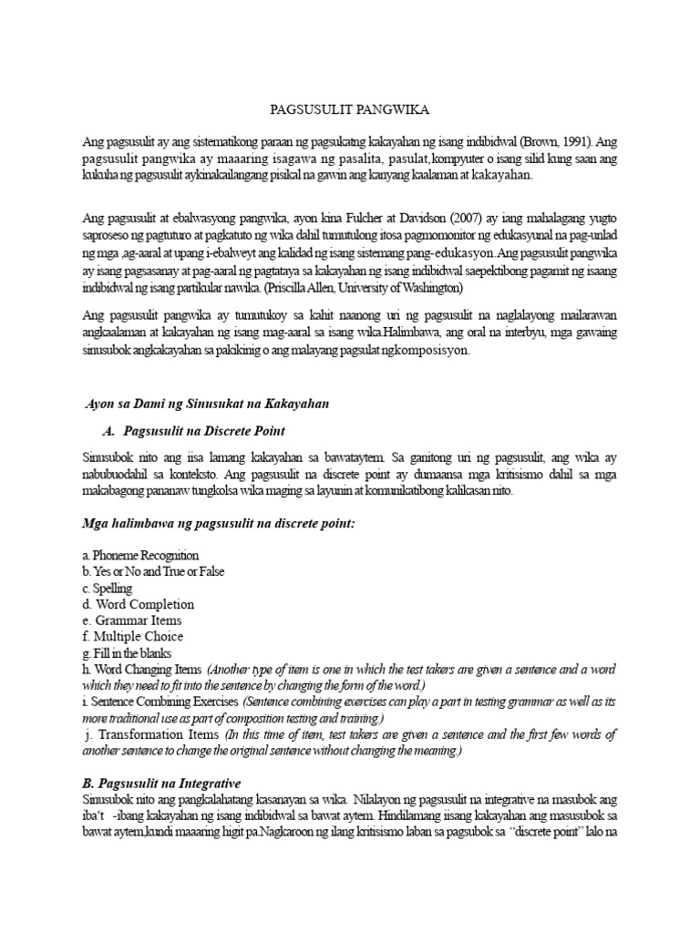 Ibat Ibang Uri Ng Pagsusulit Sa Filipino