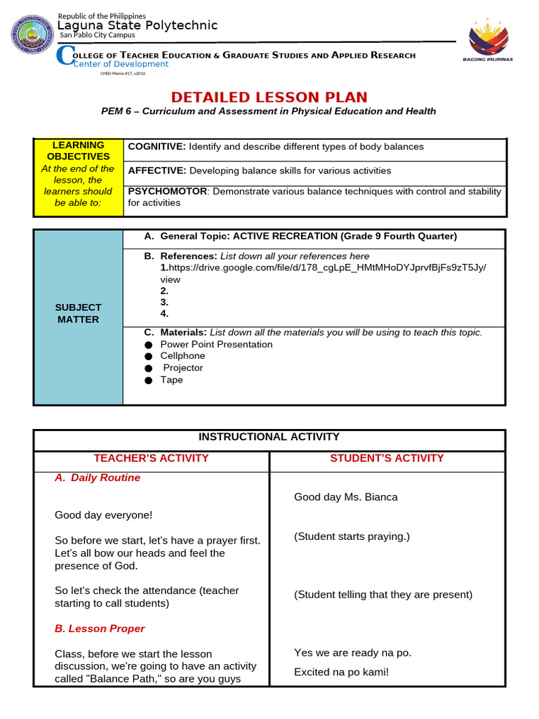 Detailed Lesson Plan Format Pem 6 | PDF | Lesson Plan | Education Theory