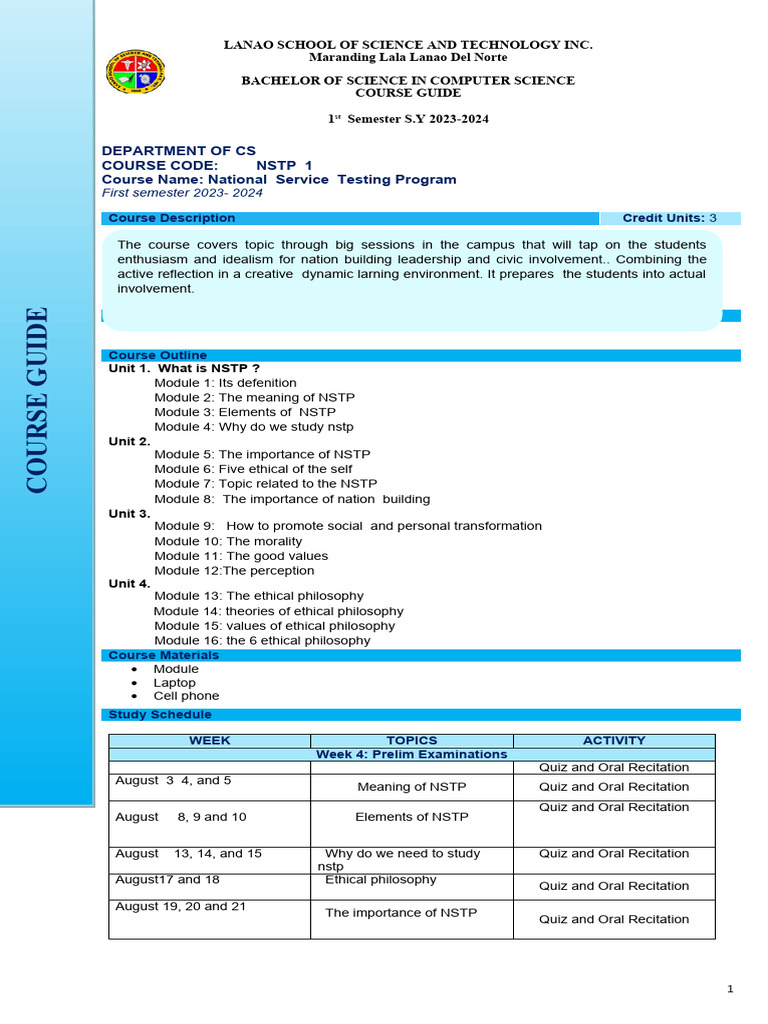 NSTP 1 - nstp-cwts - Course Outline Syllabus in NSTP 1(National Service ...