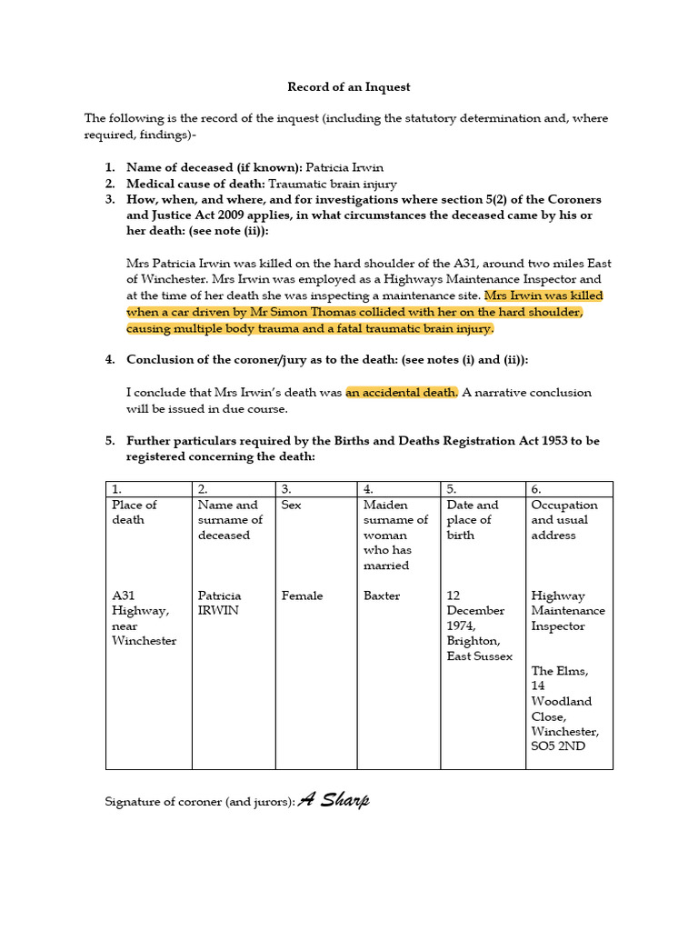 Inquest Record: Patricia Irwin's Accidental Death | PDF | Coroner