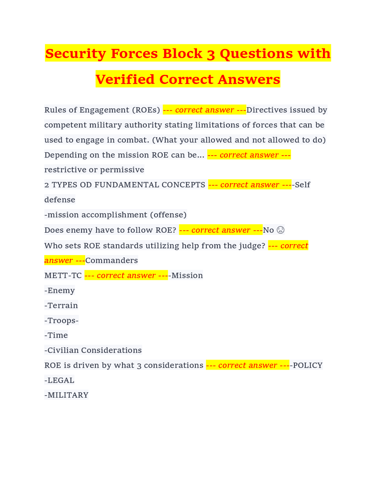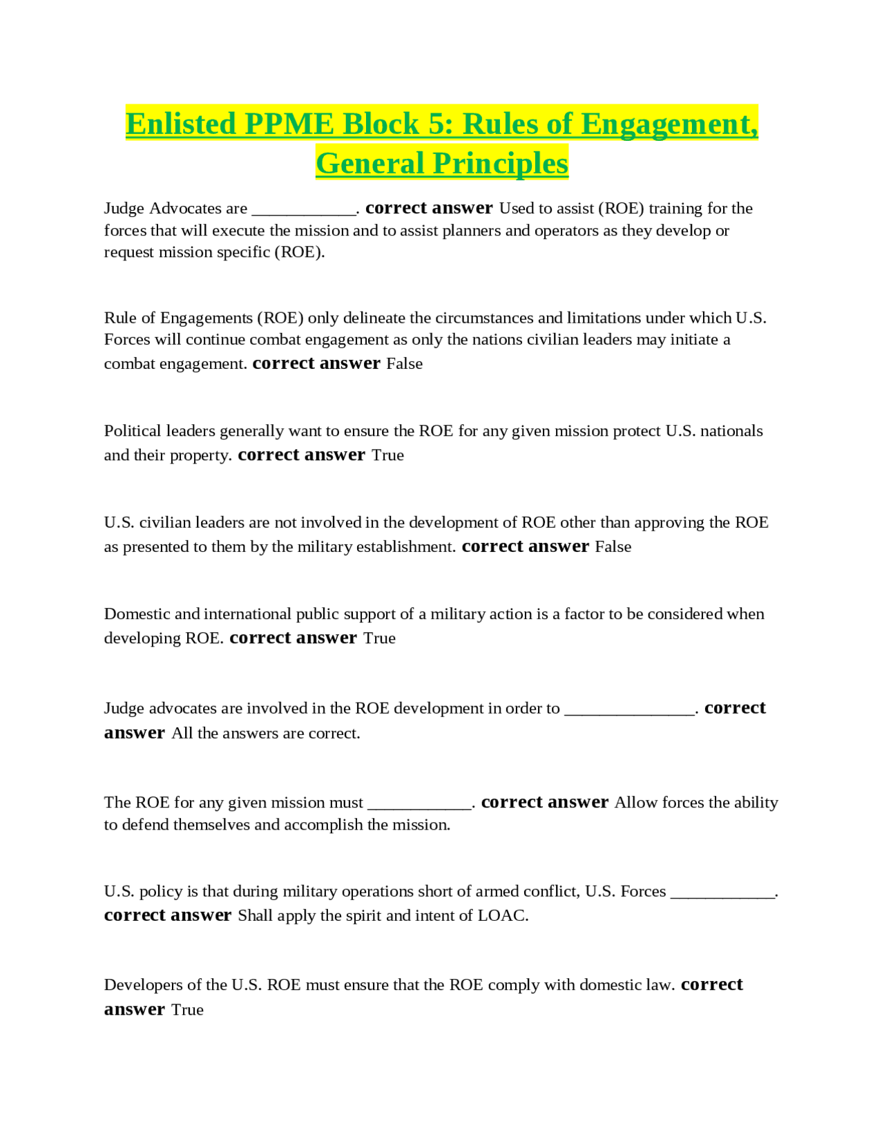 Rules of Engagement (ROE) Training: Multiple Choice Questions and ...