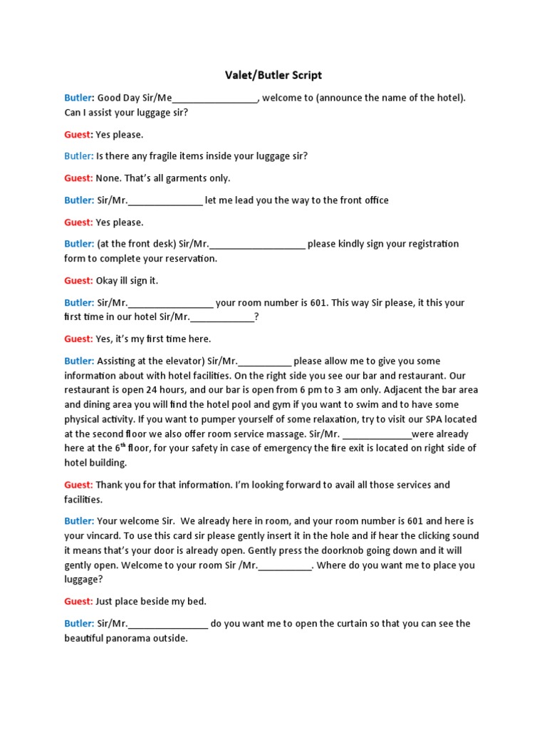 Housekeeping Script for Valet and Butler Services - HSK 101 - Studocu
