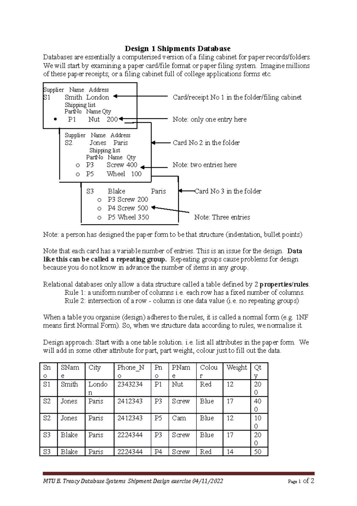 Design 1 Shipments exercise - Design 1 Shipments Database Databases are ...
