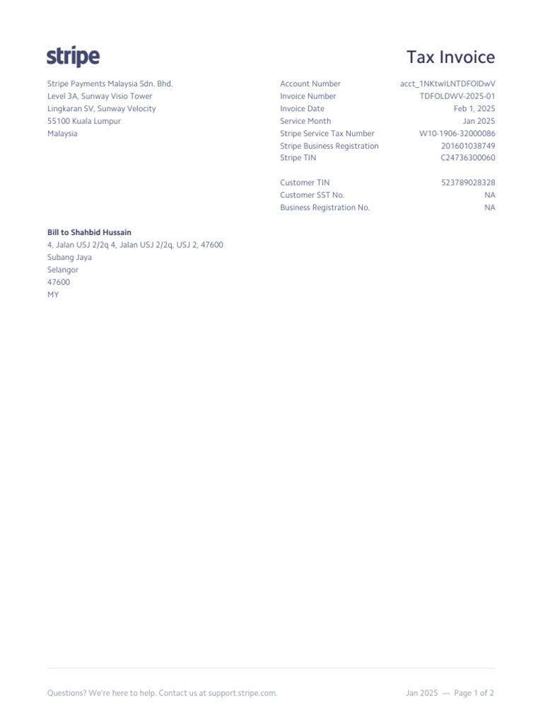 Stripe Tax Invoice TDFOLDWV-2025-01 | PDF | Money | Banking