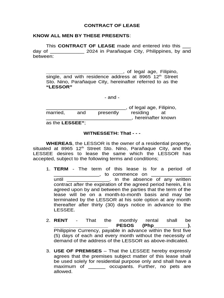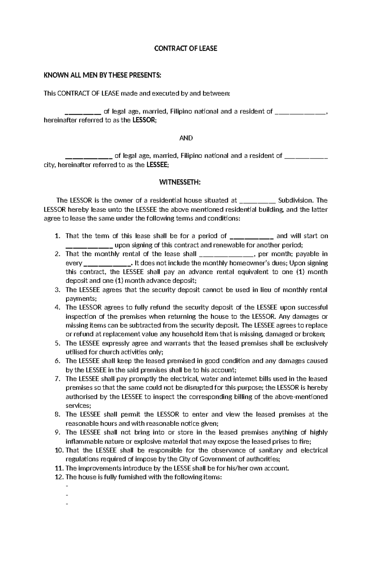 CONTRACT OF LEASE Residential Property - Template | PDF | Lease ...