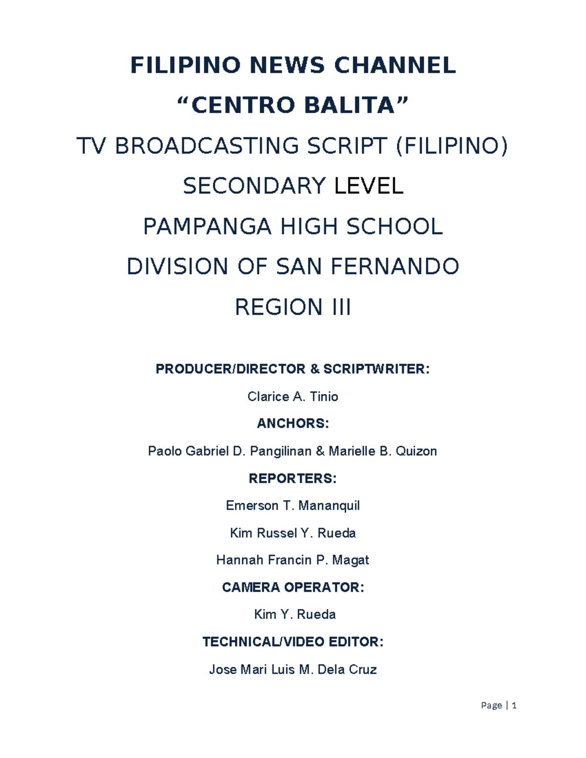 FILIPINO NEWS CHANNEL TV BROADCAST SCRIPT (SECONDARY LEVEL) - Studocu