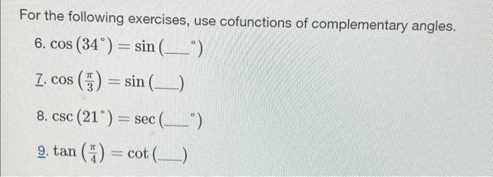Solved For the following exercises, use cofunctions of | Chegg.com